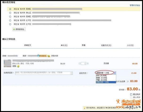 確認(rèn)收貨地址、購買數(shù)量等信息,選擇運(yùn)送方式為“貨到付款”即,系統(tǒng)會提示您選擇貨到付款運(yùn)送的價(jià)格(快遞費(fèi)加服務(wù)費(fèi)的總和)。