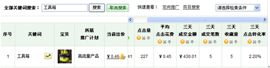 然而按照直通車實際情況卻發(fā)現(xiàn)別有洞天。同樣完成5筆交易,實際直通車所需要的點擊成本227個×0.45元/個=102元,剩余利潤129元-102元=27元,按照實際收益來觀察,推廣“工具箱”這個關(guān)鍵詞還是可以保證一定的利潤,盡管獲利很低,但是為了維持寶貝的排名和人氣,這樣的推廣還是劃算的。