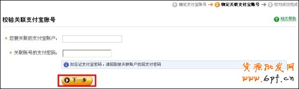 4、輸入您要關(guān)聯(lián)的支付寶賬戶及關(guān)聯(lián)賬戶的支付密碼,點(diǎn)“下一步”;