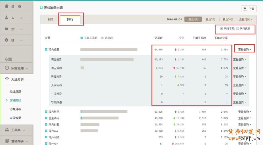 1)無(wú)線流量來(lái)源主要提供我的無(wú)線流量來(lái)源效果數(shù)據(jù)及趨勢(shì),并提供同行平均、同行優(yōu)秀數(shù)據(jù)進(jìn)行對(duì)比: