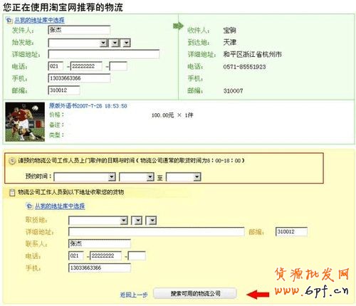 你需要在綠色區(qū)域核對(duì)你的發(fā)貨地址和買家的地址,然后在黃色區(qū)域預(yù)約物流公司的上門取貨時(shí)間。最后再核對(duì)物流的上門取貨地址,核對(duì)無(wú)誤后,請(qǐng)點(diǎn)擊“搜索可用的物流公司”,系統(tǒng)會(huì)根據(jù)你的發(fā)貨、取貨地址和預(yù)約時(shí)間,搜索出相應(yīng)的物流公司。