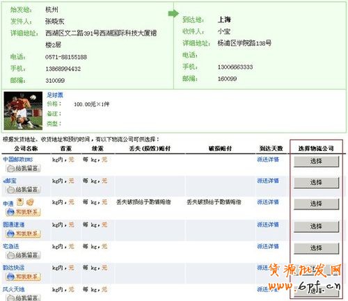 在頁(yè)面的下半部分,會(huì)列出所有可以選擇的物流公司,從列表中,你還可以直接對(duì)比各個(gè)物流公司的價(jià)格、賠付等信息,以便更好地幫你決策。然后,請(qǐng)點(diǎn)擊最后一列的“選擇”按鈕(如下圖)。選擇出相應(yīng)的物流公司,并在彈出的確認(rèn)對(duì)話框中選擇“是”。