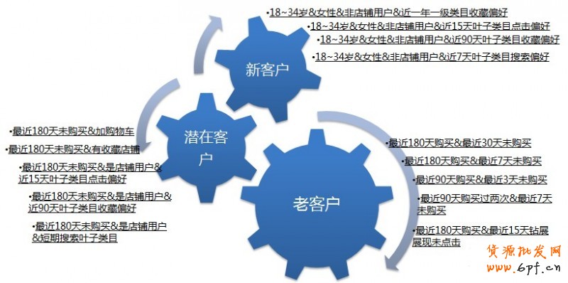 A:請看以下DMP標(biāo)簽組合案例,可以看到新客戶和潛在客戶,都是能拓展新買家和促成交的,可以從年齡、性別、(收藏偏好、點擊偏好、搜索偏好)、非店鋪用戶去組合定向,另外就是針對未購買+購物車、未購買+收藏等去組合定向