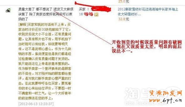 就這樣過了幾天貨收到了,收到寶貝的顧客剛開始說東西質(zhì)量有問題要求退款,而且大小不合適。我要求她拍照將其質(zhì)量有問題的地方傳給我,他說沒拍,明天再拍,天啊,拍個(gè)照用的了這么久嗎,用手機(jī)咔嚓幾下發(fā)個(gè)彩信就過來了。卻用理由推搪,我說行吧明天傳給我。(天,誰知道明天衣服會(huì)成什么樣子?)但我卻不能強(qiáng)行要求顧客。這是我和顧客的對(duì)話:我將其名字隱藏了,避免泄露別人的隱私。