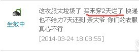 買家是3月16日下午14點51簽收的,而買家聯(lián)系我們是3月25日晚上21點13分,也就是從買家收到貨到聯(lián)系我們中間已經(jīng)過去了8天.于是我告訴買家我們收到貨會再次確認(rèn),如果衣服穿了好長時間,我們拿到廠家也不好退換.剛開如買家不只一次的重復(fù)只穿了一次,穿一次就爛了.可當(dāng)我提出穿的時間長就不好退換時,買家仿佛有些失望了.