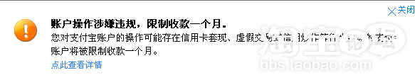 當(dāng)時(shí)我就蒙了,等我打開(kāi)支付寶的時(shí)候我才發(fā)現(xiàn),我的支付寶帳號(hào)因?yàn)椴僮魃嫦舆`規(guī),限制收款一個(gè)月!這可怎么辦呢!昨晚上都沒(méi)有真正意識(shí)到我違規(guī)了!