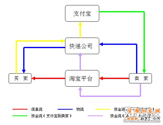 紫色部分表示賣(mài)家到快遞公司的資金流,在支付寶交易的情況下,快遞公司是賣(mài)家自己去找,現(xiàn)在貨到付款時(shí)淘寶簽約快遞公司,所以賣(mài)家對(duì)快遞公司的資金流是通過(guò)淘寶(或支付寶)來(lái)完成對(duì)快遞費(fèi)用的支付。