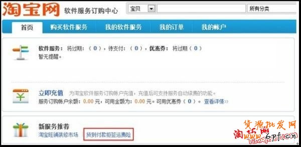 想要加入的賣家可以在淘寶網(wǎng)軟件服務(wù)訂購中心,找到相應(yīng)的“軟件服務(wù)”的“物流/支付”中訂購“COD拒簽運費險”服務(wù)。