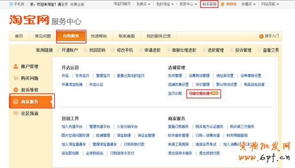 6、如果您認為您遇到了惡拍,可以在登錄狀態(tài)下點擊淘寶網(wǎng)頁右上角聯(lián)系客服——自助服務(wù)——商家服務(wù)——可疑交易處理。我們設(shè)置了專屬投訴通道: