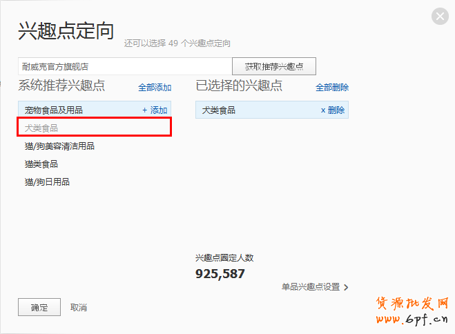 這個(gè)可能不是太容易理解,就拿上圖所示的狗糧,如果我定向到貓糧用戶或者所有寵物食品,點(diǎn)擊率肯定會(huì)掉下來(lái)的,至少很少有一個(gè)人同事養(yǎng)狗和貓吧,另外我的素材是狗糧的素材自然要定向給狗糧用戶,不廢話,上圖: