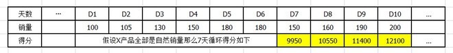 看到黃色標(biāo)注的數(shù)字沒(méi),就是X產(chǎn)品在淘寶后臺(tái)的7天循環(huán)得分,只要Y產(chǎn)品在D7-D10任意一天的得分超過(guò)了黃色標(biāo)注的節(jié)點(diǎn)數(shù)字,X的豆腐塊位置就會(huì)被替換下來(lái)。就是D7天Y的得分大于9950,D8天Y的得分大于10550,以此類推。這里又有人有疑問(wèn)了,說(shuō),X老早就在豆腐塊了,我們是新產(chǎn)品,得分怎么可能比得上X,說(shuō)實(shí)話,前期你確實(shí)比不上X,但是,別忘記了,D8天的得分是從D2-D8天算的,所以說(shuō),只要保證起點(diǎn)一樣就可以了。請(qǐng)大家不要有固定思維,再看圖,D1前面我是留了...的,就是說(shuō)D1前面還有時(shí)間,是用來(lái)給你的產(chǎn)品積累日銷量到100,只要日銷量達(dá)到相同的數(shù)字了,你們的起點(diǎn)就一樣了。這里也許還會(huì)有人想不過(guò)來(lái),要是還有問(wèn)題,請(qǐng)大家私信我。