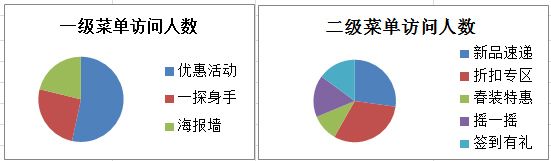 從上述圖示的菜單訪問次數(shù)和訪問人數(shù)來看,訪問熱度最大的一級菜單是“優(yōu)惠活動”。用戶點(diǎn)擊次數(shù)、訪問人數(shù)排名,優(yōu)惠活動關(guān)注度明顯最高,是其余兩項(xiàng)活動總和。而在“優(yōu)惠活動”的二級菜單中,折扣>新品>春裝,符合手機(jī)用戶群體偏向于價(jià)格優(yōu)惠商品的特點(diǎn)。