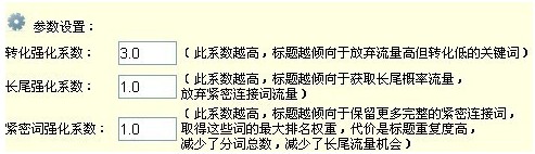 當然,其中還可以參照三個調(diào)節(jié)參數(shù),轉(zhuǎn)化強化系數(shù)越高,標題越傾向于放棄流量高但轉(zhuǎn)化低的關(guān)鍵詞,長尾強化系數(shù)越高,標題越傾向于獲取長尾概率流量,放棄緊密連接詞流量,緊密詞強化系數(shù)越高,標題傾向于保留更多完整的緊密連接詞。