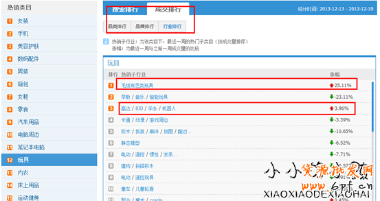 可以看到熱銷(xiāo)類(lèi)目,同類(lèi)目下的搜索、成交排行情況,比如你是做玩具類(lèi)目的,看到最近毛絨布藝類(lèi)玩具、機(jī)器人等子類(lèi)目的產(chǎn)品熱銷(xiāo)趨勢(shì)上漲,就可以考慮選款這類(lèi)產(chǎn)品來(lái)推,針對(duì)這類(lèi)產(chǎn)品查看同行品牌熱銷(xiāo)產(chǎn)品。