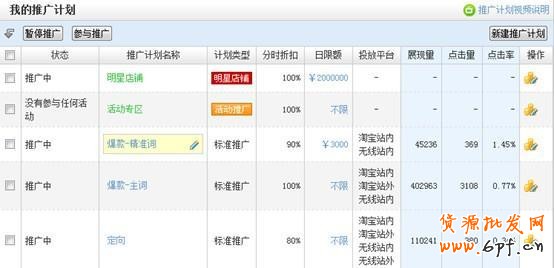 由上圖可以清楚看出,推廣計(jì)劃設(shè)定很清晰,泛詞和精準(zhǔn)詞,定向計(jì)劃單獨(dú)分開做,主要是因?yàn)辄c(diǎn)擊率相互獨(dú)立,各不影響,點(diǎn)擊率的高低跟質(zhì)量得分密切相關(guān)。另外對(duì)于不同用處的關(guān)鍵詞可以分別通過(guò)計(jì)劃管理,有針對(duì)性的設(shè)置投放時(shí)間投放區(qū)域等。定向計(jì)劃可以通過(guò)時(shí)間和人群的單獨(dú)設(shè)置更快的被抓取入池。另外定向的流量偶爾會(huì)不穩(wěn)定,可以通過(guò)單獨(dú)的設(shè)置日限額和投放時(shí)間來(lái)進(jìn)行控制。并且不會(huì)影響到關(guān)鍵詞的正常投放。如何提升點(diǎn)擊率?除了把精準(zhǔn)詞單獨(dú)挑出來(lái)之外還有做不同的推廣圖片進(jìn)行測(cè)試,選出最適合這款寶貝推廣的圖片。