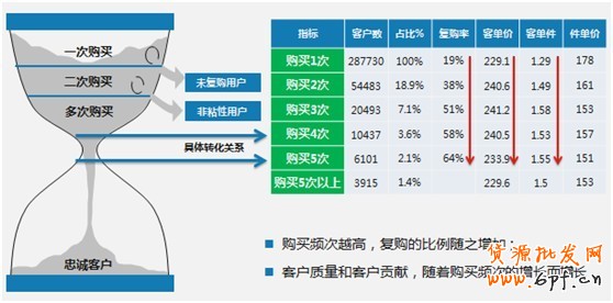 很多商家的銷售額每年翻倍增長,而利潤卻在成倍的下降,而這恰恰是很多賣家在看數(shù)據(jù)的時候會忽略的,老板更關(guān)心賣了多少,卻很少關(guān)心老客戶有多少,有價值的客戶到底有多少。通過數(shù)據(jù)漏斗,可以抓取出店鋪的忠誠客戶,看到購買一次的客戶、購買兩次以及五次以上的用戶是多少,平均購買一次的客戶單價在多少,購買了五次的又是多少。