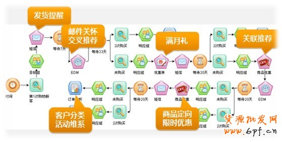 舉一個例子,如何有效延長客戶的生命周期。當(dāng)消費(fèi)者第一次進(jìn)行購物,我們針對目標(biāo)發(fā)一個短信提醒,告訴他我們發(fā)貨了;7天之后,要通過郵件關(guān)懷他是否收到并詢問情況;23天的時候,要對客戶進(jìn)行分析,哪些人已經(jīng)二次購買了,哪些人沒有購買,針對已經(jīng)購買的客戶要發(fā)送感謝信息或提供增值服務(wù)。對沒有購買的客戶可以做一些活動,例如滿月有禮。針對不同的客戶細(xì)分之后活動是完全不同。就拿滿月禮來說,每天都有客戶滿月,所以營銷要天天都去做。一般通過四五輪篩選可以有效激活一次客戶,尤其是針對聚劃算等活動過來的客戶,這招兒非常好用。