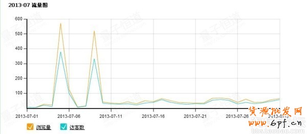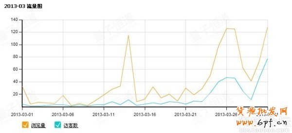 大家請(qǐng)看2013-03流量圖,我的店是2月28號(hào)注冊(cè)的店,后面然后上傳了一款寶貝,只是一款,大家注意到流量了沒,大約是在100左右,而且是很高的位置,當(dāng)然出現(xiàn)峰值的時(shí)候是7天的一個(gè)上下架時(shí)間,那個(gè)時(shí)候流量最高。