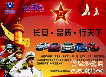 “獻禮建軍節(jié)——為了抒發(fā)我們對人民子弟兵的無比愛戴之情,百年傳承軍工企-長安汽車珠海眾大利4S店把最優(yōu)惠的價格獻給我們最可愛的人,屆時更有4臺特價車車型抄底促銷。我們沒有華麗的詞語來形容軍人,沒有動聽的歌來贊美軍人,也沒有珍貴的禮物來送給軍人,我們有的,只是一種樸實的橄欖情懷,一個普通人對軍人的真誠尊敬。”