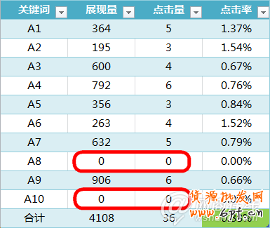 從上圖我們可以看到,A8和A10無(wú)效的展現(xiàn)是非常多的,按照上面的方法,我們把這兩個(gè)詞直接刪除,于是有了下面的結(jié)果