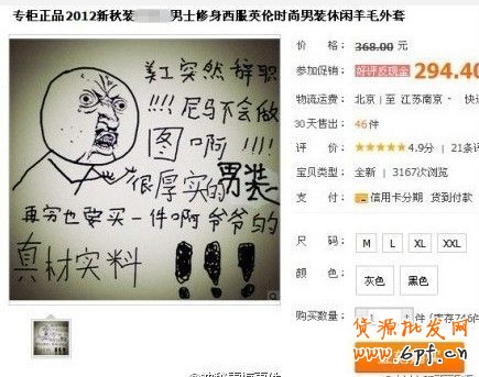 去年11月,因某網(wǎng)友在逛一家淘寶店時(shí)截圖并分享店內(nèi)搞怪圖片發(fā)在微博上,自此,一張?zhí)詫毜曛饔H自操刀的“暴走”宣傳畫(huà)便出其不意賣(mài)起萌走紅微博。店鋪賣(mài)的是“修身英倫時(shí)尚西服”,圖上畫(huà)的卻是一個(gè)面目猙獰的胖腦袋,旁邊歪歪扭扭寫(xiě)著:“美工突然辭職!不會(huì)作圖啊!很厚實(shí)的男裝,再窮也要買(mǎi)一件!真材實(shí)料!”這張看來(lái)是拙品的畫(huà)作讓眾多網(wǎng)友捧腹,引來(lái)圍觀調(diào)侃,買(mǎi)家紛紛留言表示“店主太歡樂(lè)了,這是在賣(mài)西服么”“不知道衣服長(zhǎng)什么樣感覺(jué)很刺激,300元買(mǎi)一份驚喜”。淘寶店也由此銷(xiāo)量暴增。