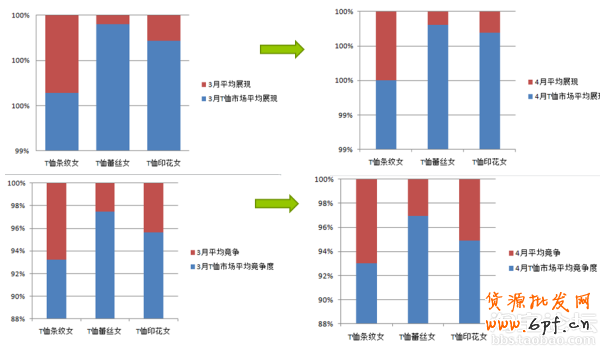 3、從綜合情況上看,相比其他熱門類目搜索和成交上升勢頭并不猛烈,且在4月底有降幅。主要還是因為季節(jié)因素,T恤類目市場還處于增長期。一方面是因為T恤整體沒有完全進入到最旺銷的季節(jié)。另一方面,款式可挑選余地比較大,建議掌柜在選品、推廣創(chuàng)意圖上多測試,了解買家和市場需求。