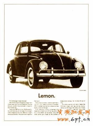 二戰(zhàn)以來最佳作品的《檸檬篇》:”我們剔除了檸檬,而你們得到了李子。“ 這條廣告只有一輛車子和一個(gè)標(biāo)題”檸檬“,人們都知道這是對(duì)一輛不滿意車子的描寫。然而在這里,它用來再次證明這的確是一輛值得紀(jì)念的誠(chéng)實(shí)車子。由于一位苛刻的大眾公司檢查員認(rèn)為這輛車子是不滿意的車子(檸檬),而這僅僅是因?yàn)檐嚿砟程幱幸稽c(diǎn)肉眼幾乎看不見的微傷,反襯出大眾公司對(duì)產(chǎn)品質(zhì)量的要求是多么嚴(yán)格。 經(jīng)過他妙手回春,甲殼蟲老樹發(fā)新枝,迅速登上美國(guó)市場(chǎng)進(jìn)口汽車第一的寶座,并且因此長(zhǎng)盛不衰。
