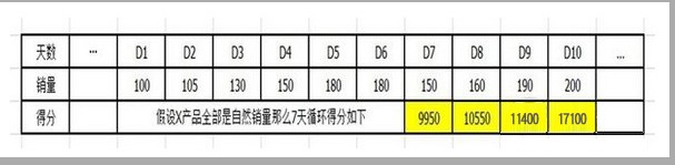 圖中黃色標注的數(shù)字,就是X產(chǎn)品在淘寶后臺的7天循環(huán)得分(如9950=(D1+D2+D3+D4+D5+D6+D7)*10, 10550=(D2+D3+D4+D5+D6+D7+D8)*10 )只要Y產(chǎn)品在D7-D10任意一天的得分超過了黃色標注的節(jié)點數(shù)字,X的豆腐塊位置就會被替換下來。就是D7天Y的得分大于9950,D8天Y的得分大于10550,以此類推。這里又有人有疑問了,說,X老早就在豆腐塊了,我們是新產(chǎn)品,得分怎么可能比得上X,說實話,前期你確實比不上X,但是,別忘記了,D8天的得分是從D2-D8天算的,所以說,只要保證起點一樣就可以了。不要有固定思維,再看圖,D1前面我是留了...的,就是說D1前面還有時間,是用來給你的產(chǎn)品積累日銷量到100,只要日銷量達到相同的數(shù)字了,你們的起點就一樣了。