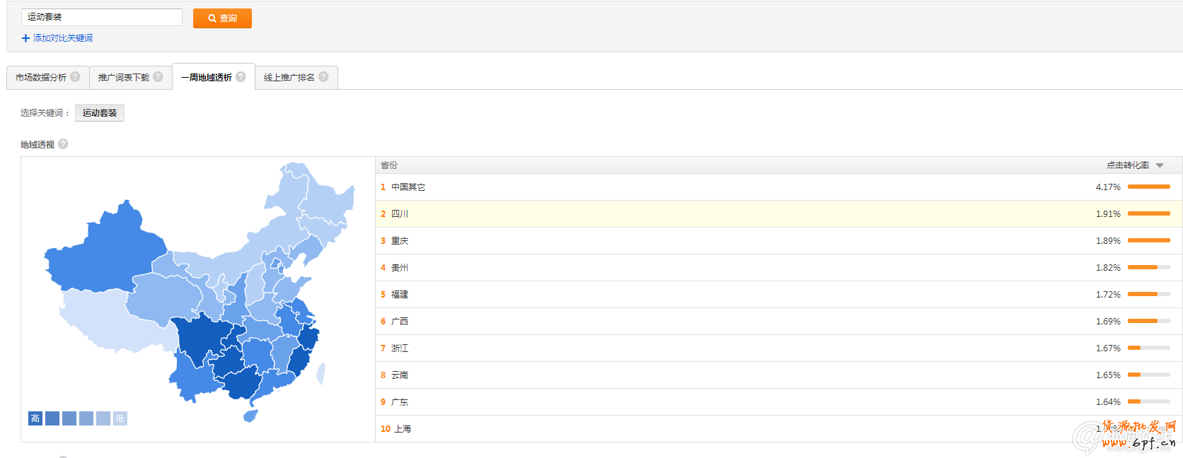 以上數(shù)據(jù)表圖粗略可以得出,四川省的點(diǎn)擊率及點(diǎn)擊指數(shù)為所有省份最高,同時(shí),展現(xiàn)人數(shù)在此關(guān)鍵字下具有一定的比重。PS:關(guān)鍵字的展現(xiàn),點(diǎn)擊,點(diǎn)擊轉(zhuǎn)化需要有一定的量,才可以具備參考的意義,具體的量級(jí)可以根據(jù)不同類(lèi)目的流量情況進(jìn)行差別。