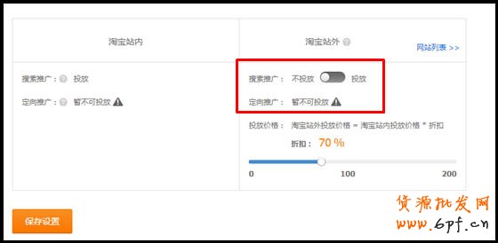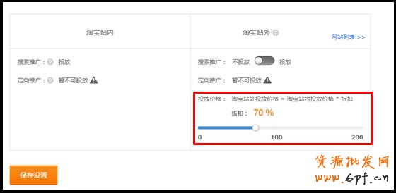 目前無法對單個推廣寶貝的關(guān)鍵詞或類目單獨(dú)設(shè)置站外投放的價格,但是可以在設(shè)置投放平臺的功能中,去調(diào)整一個推廣計劃內(nèi)寶貝的站外投放出價比例。