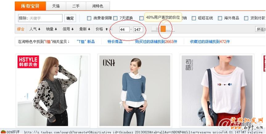 通過熱詞:t恤,根據(jù)第一順位48%用戶喜歡的價(jià)位(44-147元),這個(gè)價(jià)格就是促銷價(jià),不是市場價(jià)格,搜索到有12862417件寶貝,按照7天展示1次。
