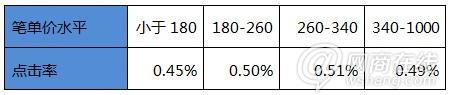 女裝-中老年女裝這個(gè)二級(jí)類目的平均點(diǎn)擊率【0.55%-0.6%】,但是不同筆單價(jià)水平下的點(diǎn)擊率情況也有所不同。