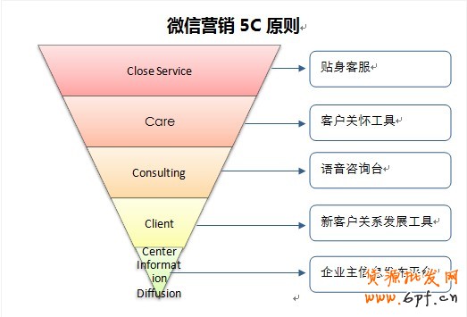 筆者認(rèn)為要把微信當(dāng)做為粉絲提供有價(jià)值服務(wù)的工具才能保持現(xiàn)有粉絲,將微信做成企業(yè)的擬人化交流工具,才可能激活粉絲的主動(dòng)傳播的可能,從而二次增加新客戶。如果從運(yùn)維微信遵循的基本原則來講,可以從5個(gè)C出發(fā):貼身客服(Close Service)、客戶關(guān)懷工具(Care)、語音咨詢臺(Consulting)、新客戶關(guān)系發(fā)展工具(Client)、企業(yè)主。
