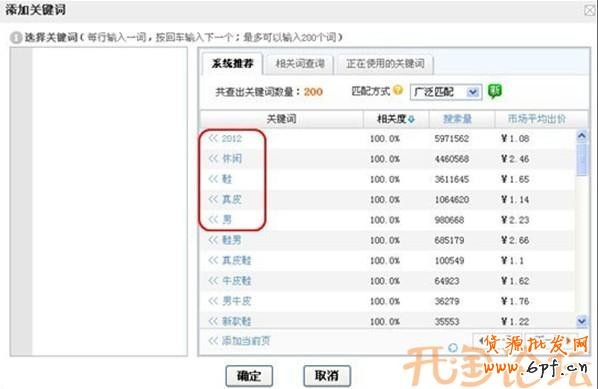 注意事項(xiàng):很多新加入直通車(chē)的掌柜直接將系統(tǒng)推薦的200個(gè)關(guān)鍵詞全部添加,其實(shí) 系統(tǒng)推薦關(guān)鍵詞并非全部適合推廣。如:下圖選中的這些關(guān)鍵詞都比較寬泛,不推薦單獨(dú)做為關(guān)鍵詞使用,但是可以組合使用如:“2012 真皮休閑鞋”。