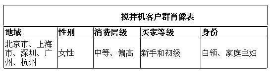 通過上面6個維度的數(shù)據(jù)分析,可以做出一張“攪拌機客戶群肖像表”。