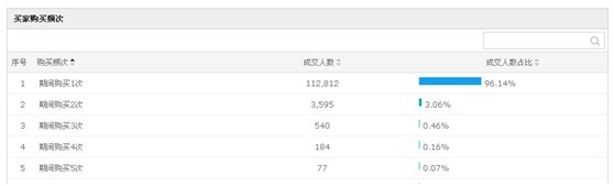 困惑2:知道客戶購買的次數(shù),才好分析對老顧客的營銷力度。打開數(shù)據(jù)魔方買家購買分析,客戶購買2次占3.06%以上,說明二次購買率很小,購買1次的客戶96.14%占了客戶群的絕對大多數(shù)。這說明在這個類目下,商家的老客戶營銷效果也不佳。