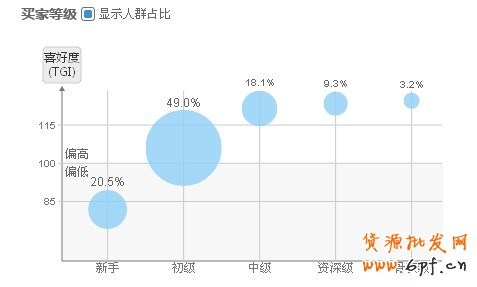 買家等級主要是對買家淘寶購物的歷史筆數(shù)來劃分的,這樣可以幫助賣家了解客戶和客服之間可能的關系的內容范圍。買家等級劃分為新手、初級、中級、資深級、骨灰級 5個等級,通過淘寶指數(shù)可以得到以下數(shù)據(jù):