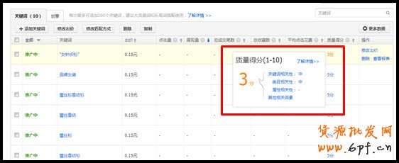質(zhì)量得分主要是用于衡量關(guān)鍵詞與寶貝推廣信息和淘寶網(wǎng)用戶搜索意向三者之間的相關(guān)性,有助于通過(guò)天貓/淘寶直通車向淘寶網(wǎng)賣家展現(xiàn)與其購(gòu)買意愿更相關(guān)的寶貝。具有相關(guān)性的寶貝推廣信息往往能夠吸引更多的點(diǎn)擊詞數(shù)。贏得更高的排名。