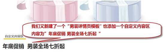 第五,在剛才添加“女裝詳情頁模板”里面添加一個個性的自定義內(nèi)容區(qū)。如女裝買一送一,年底促銷