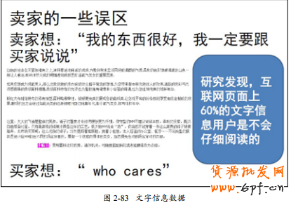 在網(wǎng)店頁(yè)面優(yōu)化的過程中,有很多細(xì)節(jié)是值得關(guān)注的,很多人說,我的店鋪元素鋪設(shè)得很多,訪問深度也不錯(cuò),但是轉(zhuǎn)化率一直上不去,原因極有可能是在某些元素的表達(dá)上我們走進(jìn)了誤區(qū)。如圖2-83所示展示的賣家誤區(qū)是非常常見的,賣家想“我的東西很好一定要跟買家說說”,于是用了大篇幅的文字去表達(dá)賣家的意思,但是圖右邊顯示現(xiàn)在已經(jīng)進(jìn)入了讀圖時(shí)代,60%的文字信息網(wǎng)絡(luò)瀏覽者是不會(huì)仔細(xì)閱讀的,所以賣家想表達(dá)的信息最好使用圖片來表達(dá)或者使用一至兩句文字來表達(dá),這樣才能把信息更好地傳達(dá)給顧客。