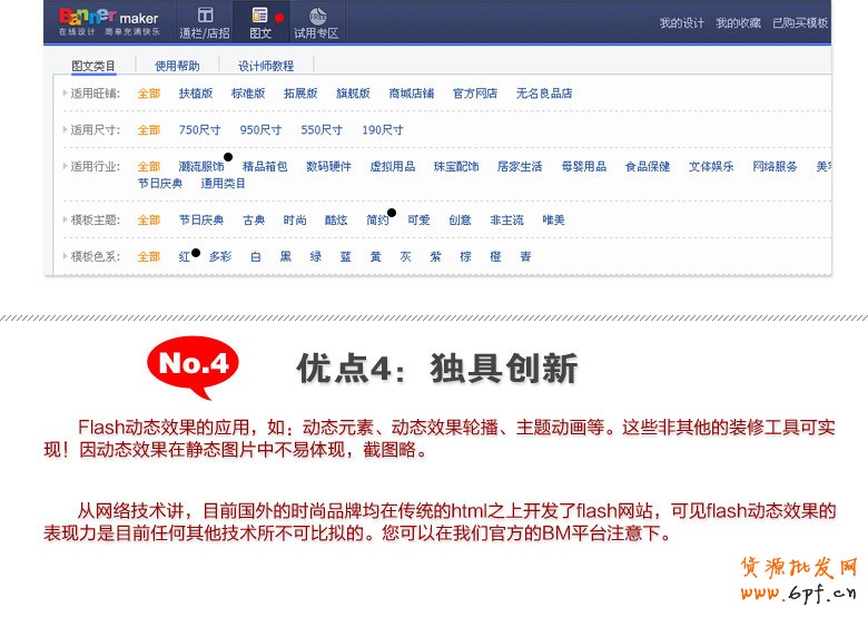 Banner maker創(chuàng)新于08年初,是在線即時(shí)生成flash廣告牌工具。成立至今深受淘寶網(wǎng)絡(luò)、阿里媽媽等商家喜愛。且千名專業(yè)設(shè)計(jì)師每日更新,涵蓋圖文、類目、收藏、賀卡……下面開始我們的第一課,Banner maker產(chǎn)品介紹。
