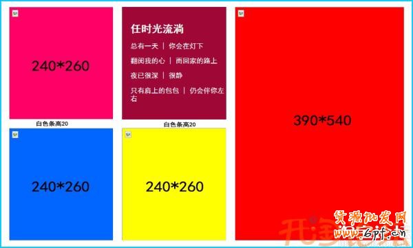 圖中的白色部位占據(jù)一行或一列,彩色模塊為圖像占位符,用來鏈接圖片的。
