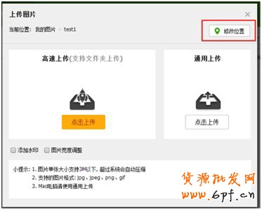 第三步,點(diǎn)擊上傳圖片后會(huì)彈出一個(gè)框框,然后在框框右上角有一個(gè)“修改位置”,點(diǎn)擊修改位置,就可以指定所需要上傳的文件夾或者圖片,到指定的文件夾下。具體操作可見下圖: