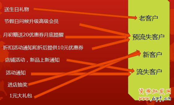 流失客戶則是半年以上購(gòu)買(mǎi)過(guò)一次就再也沒(méi)有進(jìn)來(lái)過(guò)店鋪的。老客戶則是購(gòu)買(mǎi)次數(shù)大于1次并且在90天內(nèi)來(lái)過(guò)店鋪的。在進(jìn)行這樣的一個(gè)分層以后,做了一個(gè)基礎(chǔ)的營(yíng)銷(xiāo)手段: