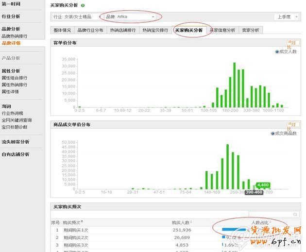 從這張圖片我們可以看到女裝類目在上一季度的買家分析數(shù)據(jù),該類目下一次購買占比67%,2次購買占比20%左右。