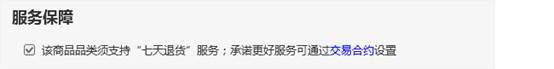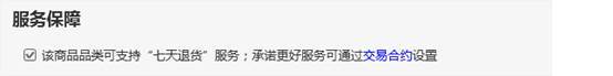 一、 對(duì)于根據(jù)商品性質(zhì)不支持"七天退貨"服務(wù)的商品,前臺(tái)不再展示七天退貨的標(biāo)簽。如果賣家表示能支持退貨服務(wù)的,需要通過(guò)退貨承諾這一交易合約設(shè)置8天(含)以上的服務(wù)。