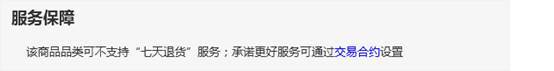 不支持"七天退貨"的商品,默認(rèn)出現(xiàn)以下提示,如新鮮蔬果、定制商品、期刊圖書(shū)等;如要支持退貨服務(wù),請(qǐng)通過(guò)交易合約設(shè)定