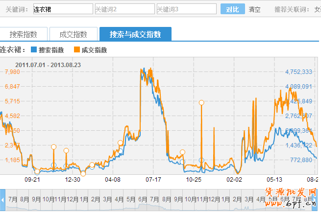 了解主打各葉子類目的曲線圖--結(jié)合每月聚劃算類目規(guī)劃排期和坑位數(shù)量,利用淘指數(shù)查看近二年葉子類目趨勢(shì)【如下圖葉子類目:連衣裙】,了解商品銷量需求趨勢(shì)。為選款做準(zhǔn)備。