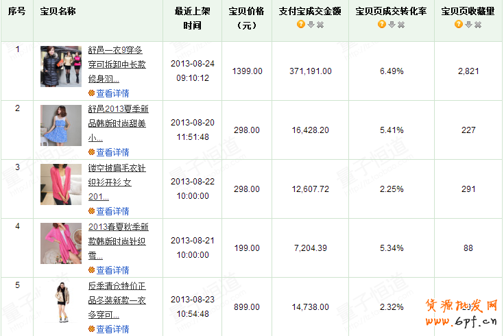 例:如下圖所示,綜合數(shù)據(jù)發(fā)現(xiàn)1號(hào)寶貝轉(zhuǎn)化率高達(dá)6%,收藏率高達(dá)2800!通過(guò)其他數(shù)據(jù)綜合對(duì)比,最終確定1號(hào)為聚劃算款式。