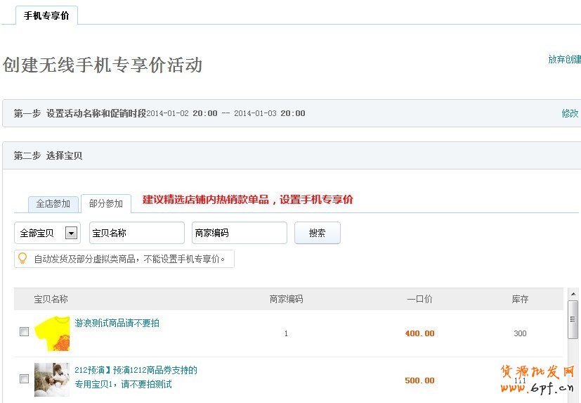 在下方列表中選擇參加活動的寶貝商品,可瀏覽當前的一口價和庫存情況;確認已選擇的寶貝后完成選擇。